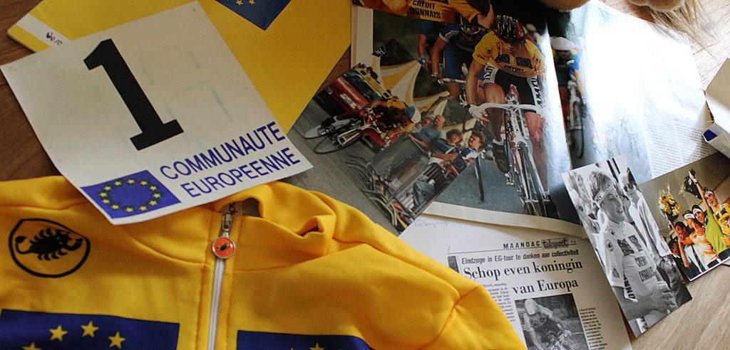 Natuurlijk wil ze in de tuin even poseren voor een foto. Truitje aan, voor de muur en lachen maar. “Moet ik het leeuwtje ook nog even vasthouden?” Opvallend aan de maillot jaune zijn de goed zichtbare Europese vlaggen. Die vind je niet op de gele trui van de Tour voor mannen. Wat gelijk de vraag opwerpt: was dit wel een echte Tour? Schop vindt van wel. “Het werd destijds niet meer tegelijk met de mannentour georganiseerd, maar we hadden dezelfde sponsoren en organisatie. Het heette dan misschien de Ronde van de Europese Gemeenschap, maar iedereen was het erover eens dat het in die tijd de grootste etappekoers was. Dus ik vind dat ik mag zeggen dat ik de Tour heb gewonnen.”