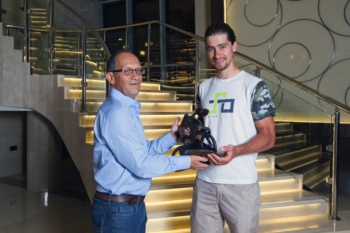 Hugo Coorevits overhandigt Peter Sagan de trofee van Flandrien van het jaar. Foto: Raymond Kerckhoffs