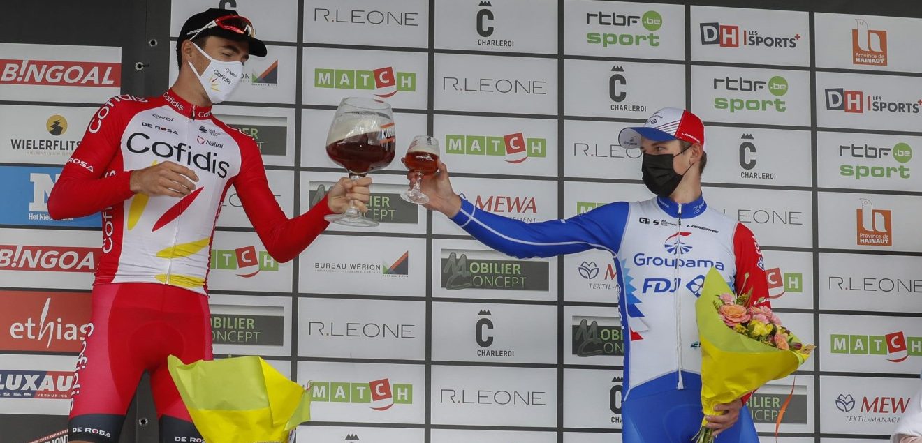 Pithie (derde) proost met winnaar Christophe Laporte na Circuit de Wallonie – foto: Cor Vos