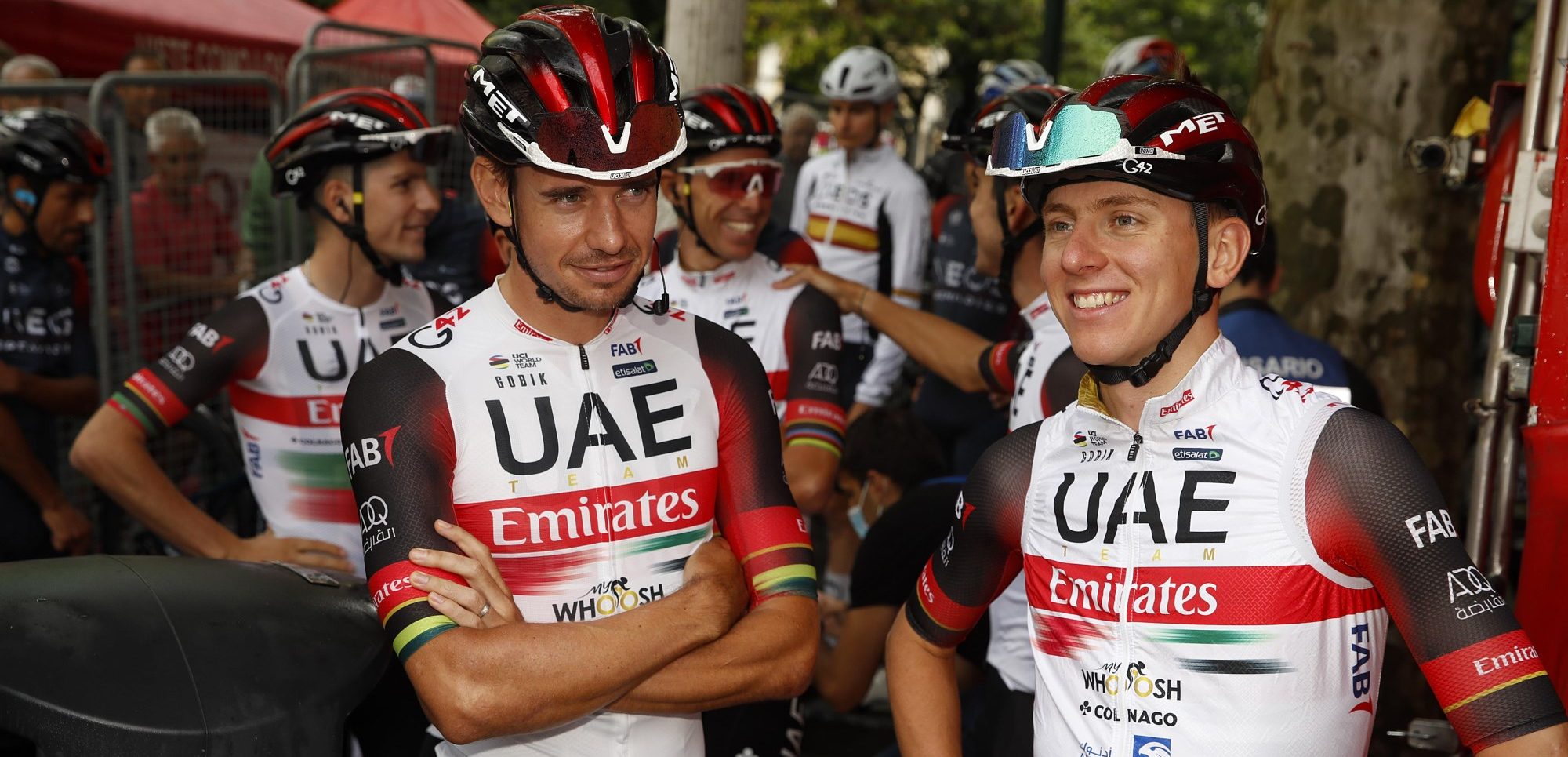 Gibbons voor de start van Clásica San Sebastián met Pogačar – foto: Cor Vos