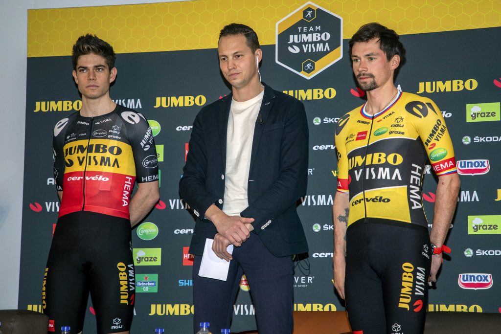 De sleutelfiguren Wout van Aert en Primoz Roglic op de ploegvoorstelling in Alicante. Foto: Raymond Kerckhoffs