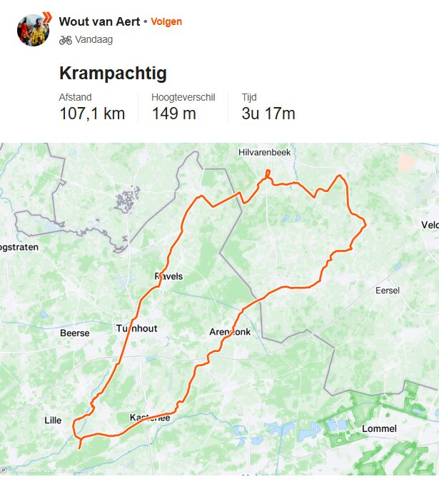“Krampachtig”, zo omschrijft de Belg van Visma | Lease a Bike zijn trainingstocht op de populaire app Strava. Van Aert zat ruim drie uur op de fiets voor een trainingsrit van 107 kilometer. Zijn gemiddelde snelheid? Net iets meer dan 32 kilometer per uur.