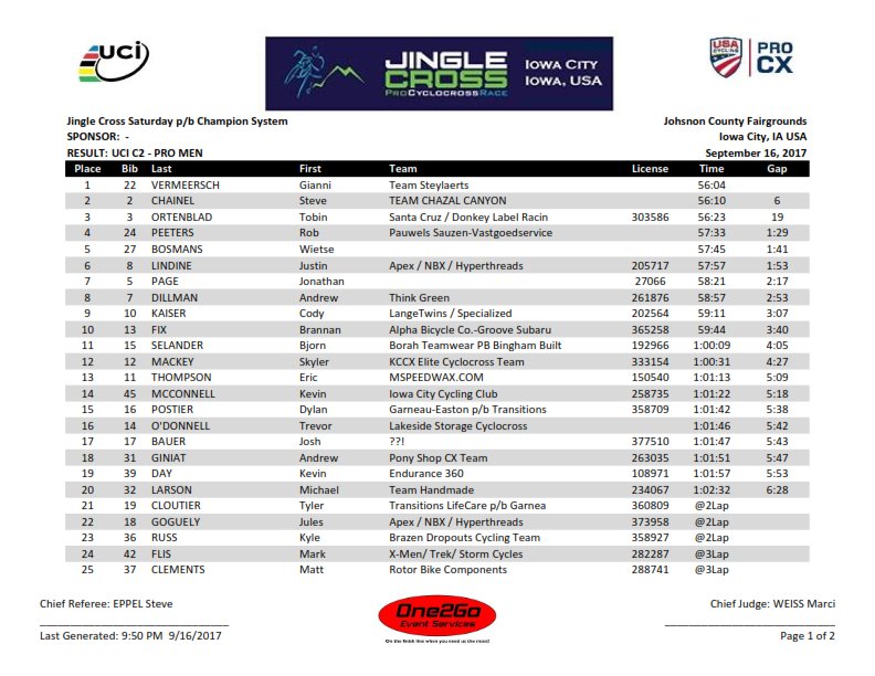 Na de vrijdagwedstrijd (UCI C1) werd ook op zaterdag een voorbereidingskoers gereden. Deze Jingle Cross van C2-niveau kwam op naam van Gianni Vermeersch. De Belgische crosser van Steylaerts, die op de weg nog de Slag om Norg won, bleef Steve Chainel en Tobin Ortenblad voor in Iowa. De twee andere Belgen aan de start, Rob Peeters en Wietse Bosmans, werden respectievelijk vierde en vijfde.