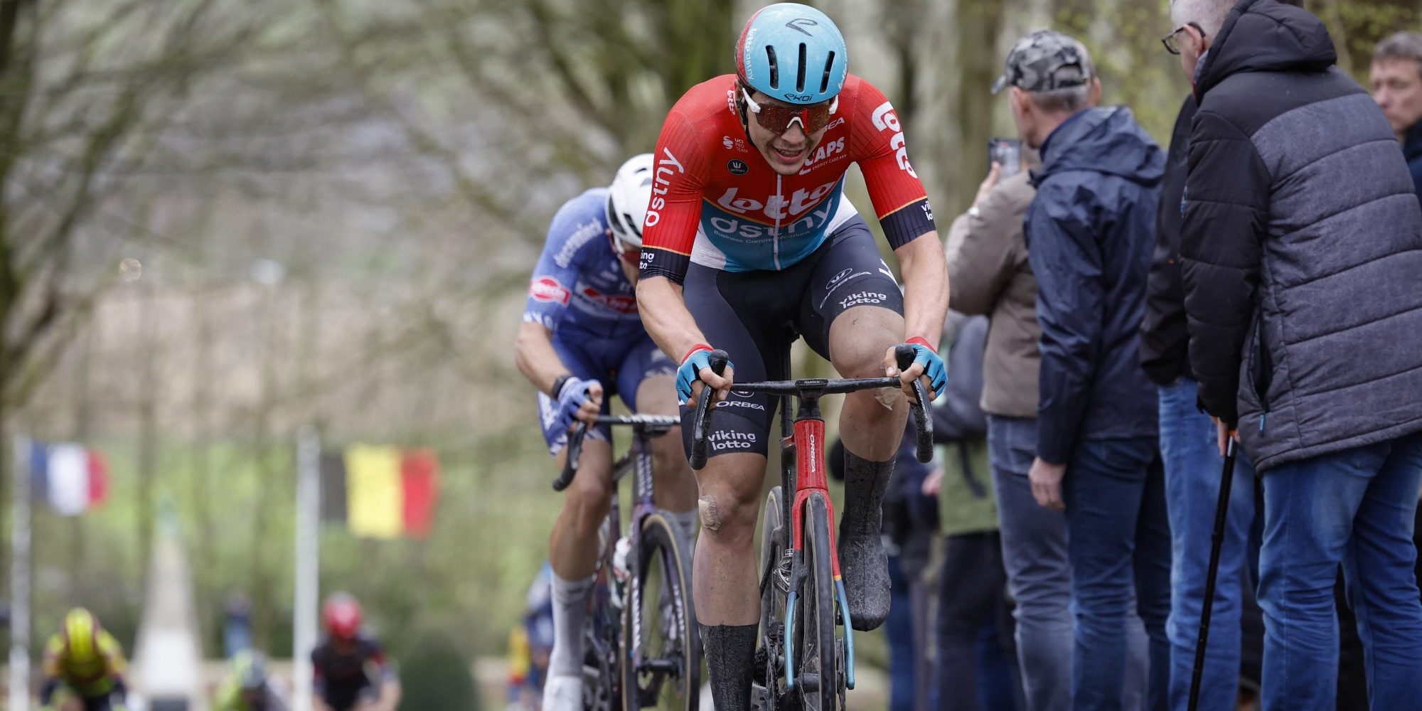 Te meer omdat er halverwege een heuvelzone lag te wachten die doet denken aan Gent-Wevelgem. Daar wachtten twee beklimmingen van de Kemmelberg (langs de twee verschillende kanten) en de Baneberg. Opvallend genoeg waren het op de eerste keer Kemmelberg de troepen van Intermarché-Wanty die de koers hard probeerden maken. Met vier zaten ze rond hun snelle man Gerben Thijssen, die nog goed mee naar boven ging ook. Al maakte Arnaud De Lie §Lotto Dstny) misschien nog het meeste indruk, net als Dries Van Gestel (TotalEnergies).