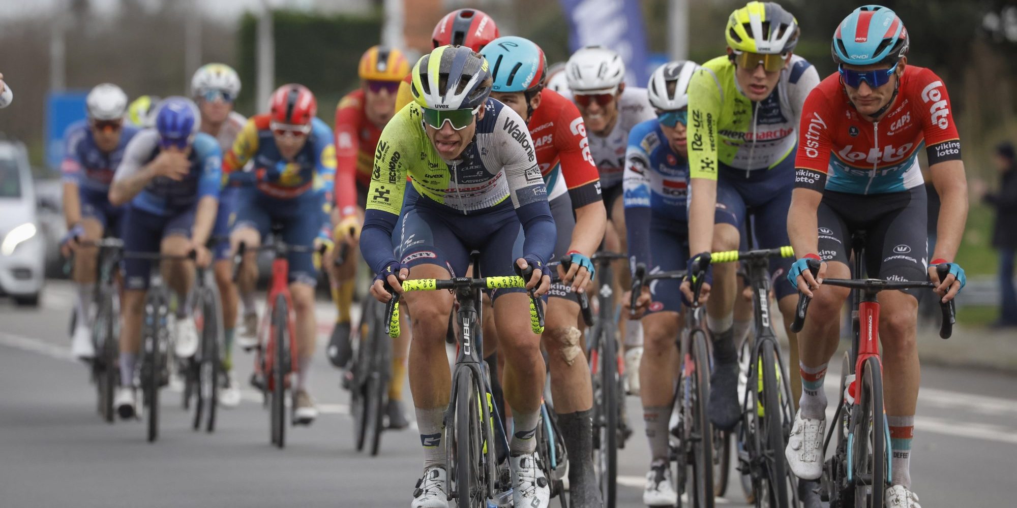 Arnaud De Lie was daar in eerste instantie niet bij, maar de talentvolle Waal van Lotto Dstny deed dan maar het onmogelijke. De Lie dichtte eigenhandig een kloof van een honderdtal meter, in volle zijwind. Een stevige inspanning waar een coureur normaliter niet in kan slagen, maar De Lie deed het toch en nam zo zijn positie in de eerste waaier in, naast ploegmaat Brent Van Moer, het trio Gerben Thijssen, Madis Mikhels en Roel Van Sintmaartensdijk (Intermarché-Wanty), Gil Gelders (Soudal Quick-Step), John Degenkolb, Luka Mezgec, Robbe Ghys (Alpecin-Deceuninck), Luca Mozzato (Arkéa-B&B Hotels), Simone Consonni, Hugo Hofstetter (Israel-Premier Tech) en Rasmus Wallin (Uno-X).