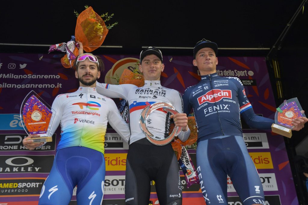 Dat Van der Poel achteraf baalt van zijn derde plek valt te begrijpen. Vrij gemakkelijk won hij de sprint van de groep om de laatste podiumplaats. Natuurlijk verdient Matej Mohoric alle credits. Zijn demarrage (4,4 kilometer van de streep) en verdere afdaling van de Poggio waren heel indrukwekkend. En zijn ploeg Bahrain Victorious heeft slim een extra wapen aan zijn fiets voor de afdaling toegevoegd door een zadelpen met een dropper post vanuit de mountainbike-wereld te installeren.