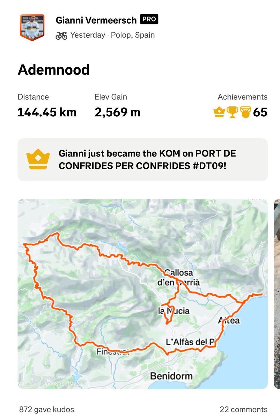 Mathieu van der Poel en ploegmaat Gianni Vermeersch zijn op KOM-jacht gegaan aan de Costa Blanca. Met succes overigens, want Vermeersch is de nieuwe KOM op de Puerto de Confrides, een klim van 20,5 kilometer met een gemiddeld stijgingspercentage van 3,5 procent.