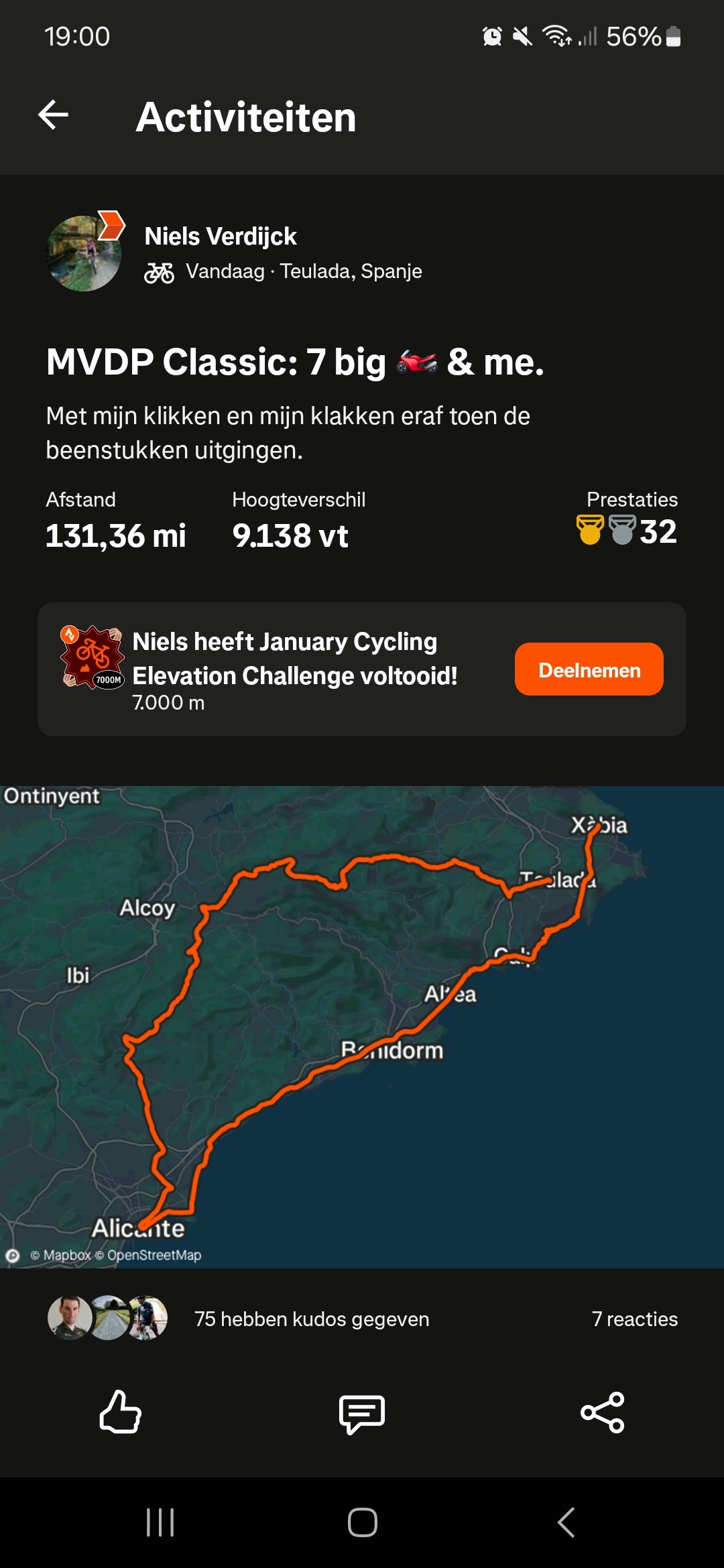 Van der Poel was op pad met zijn ploeggenoten van Alpecin-Deceuninck – onder wie Jonas Rickaert, Quinten Hermans, Gianni Vermeersch en Timo Kielich – zijn vaste trainingsmakker en goede vriend Freddy Ovett en zijn Belgische trainingsmaat Niels Verdijck. Voor die laatste was het toch flink afzien. “Met mijn klikken en mijn klakken eraf toen de beenstukken uitgingen”, schrijft hij op Strava.