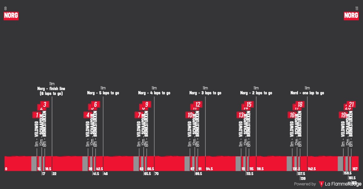 De renners rijden zaterdag in Norg een rondje van 23 kilometer, tegen de klok in. Bijna vijf van die kilometers gaan over onverharde stroken. Ten zuiden van het dorpje Peest zijn de Veldweg (2500 meter), Schaapdijk (1200 meter) en Brinkstukken (1000 meter) de drie scherprechters. De mannen rijden het rondje zeven keer, goed voor een UCI 1.2-koers over ruim 165 kilometer. Voor het eerst is er ook een vrouwenkoers. Deze wedstrijd (93 kilometer) geldt als slotstuk van de Kalas Topcompetitie. De grootste blikvanger in die koers is de Friese veldrijdster Leonie Bentveld.