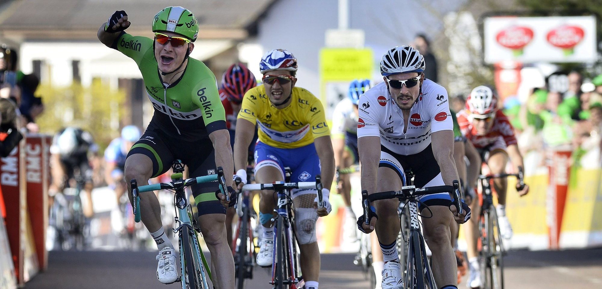 Hofland won in 2014, in het groene Belkin-truitje, een etappe in Parijs-Nice – foto: Cor Vos