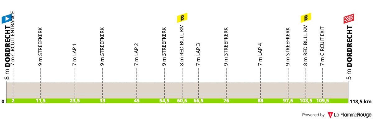 De eerste echte etappe van de Tour of Holland telt slechts 115 kilometer. Rond 13.45 uur klinkt het startschot op het Statenplan, waarna de renners eerst een sfeervolle neutralisatie rijden door het oude stadscentrum van Dordrecht en Zwijndrecht, waarna het officiële startschot om 14.20 uur wordt gelost als de renners over de Alblasserdamsebrug zijn gereden.