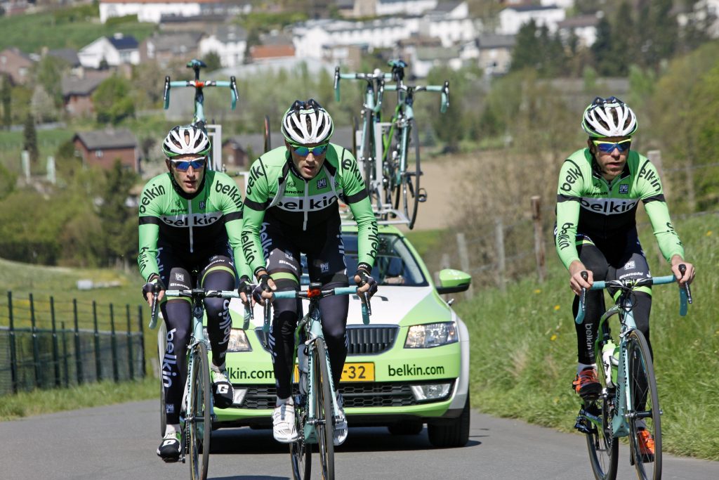 Met zijn maatjes Jos van Emden (l) en Bram Tankink (r) verkent Paul Martens in de kleuren van Belkin de finale van de Amstel Gold Race in 2014. foto: Raymond Kerckhoffs