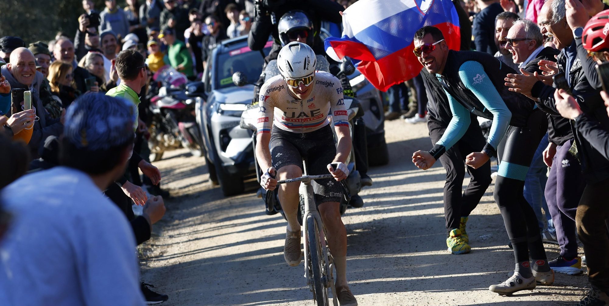 Imponerend, impressionant, heroïsch, indrukwekkend: superlatieven schieten tekort om de prestatie van Tadej Pogacar te omschrijven in Strade Bianche. De Sloveen zegevierde in de Italiaanse klassieker, na een solo van 81(!) kilometer. Tom Pidcock kwam na afloop met een treffende omschrijving. “Het was alsof hij meedeed aan een juniorenkoers.”