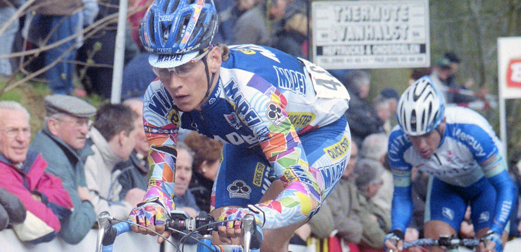 Een piepjonge Pozzato bedwingt in 2001 (!) de Kemmelberg tijdens Gent-Wevelgem – foto: Sirotti