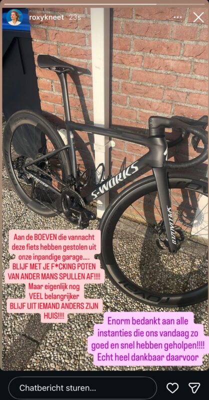 “Aan de BOEVEN die vannacht deze fiets hebben gestolen uit ons inpandige garage… BLIJF MET JE F*CKING POTEN VAN ANDERMANS SPULLEN AF!!!”, schrijft de analist en koersdirectrice van de NIBC Tour of Holland in haar verhaal. “Maar eigenlijk nog VEEL belangrijker: BLIJF UIT IEMAND ANDERS ZIJN HUIS!!!”