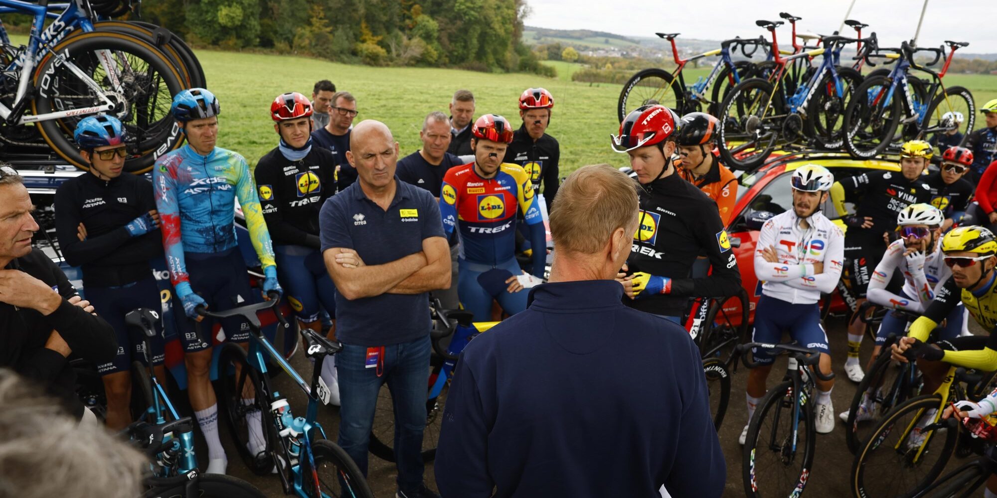 Thijs Rondhuis spreekt renners en ploegleider toe in de NIBC Tour of Holland – foto: Fotopersburo Cor Vos