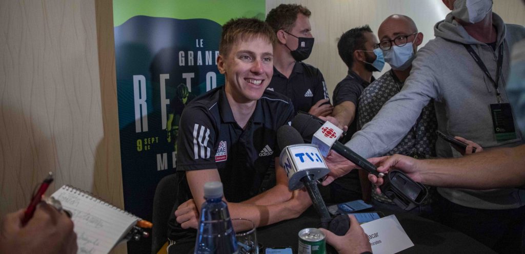 Tadej Pogacar op persconferentie in Quebec. Foto: Raymond Kerckhoffs
