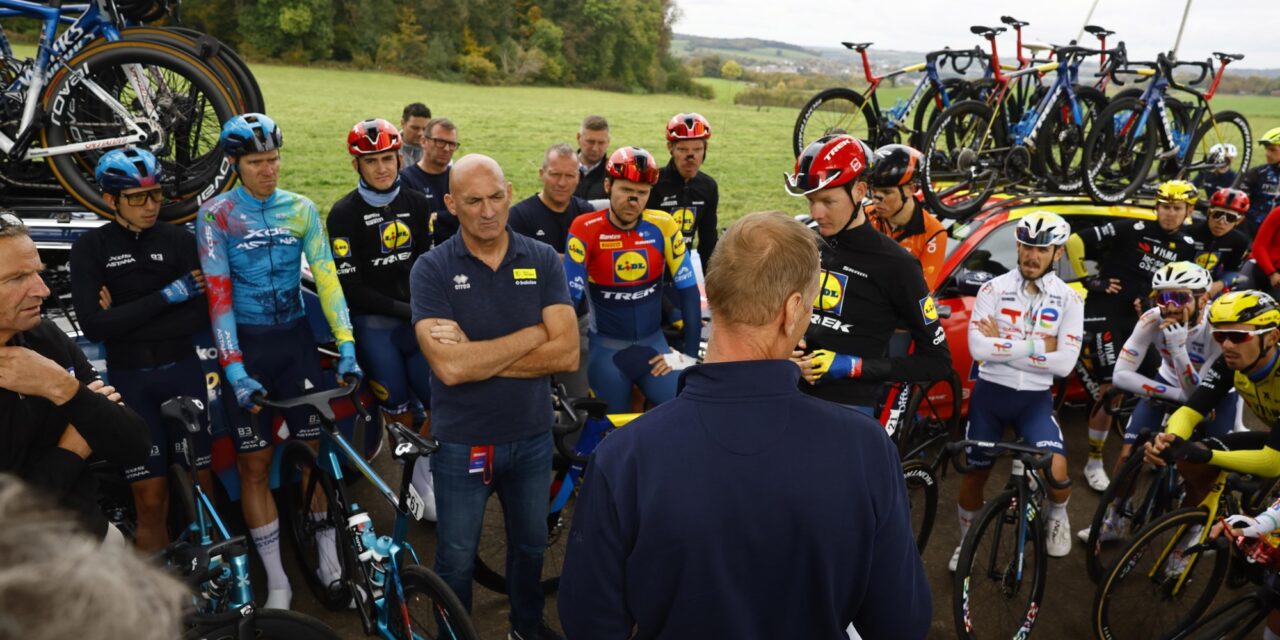 Rondhuis spreekt renners en ploegleider toe – foto: Cor Vos