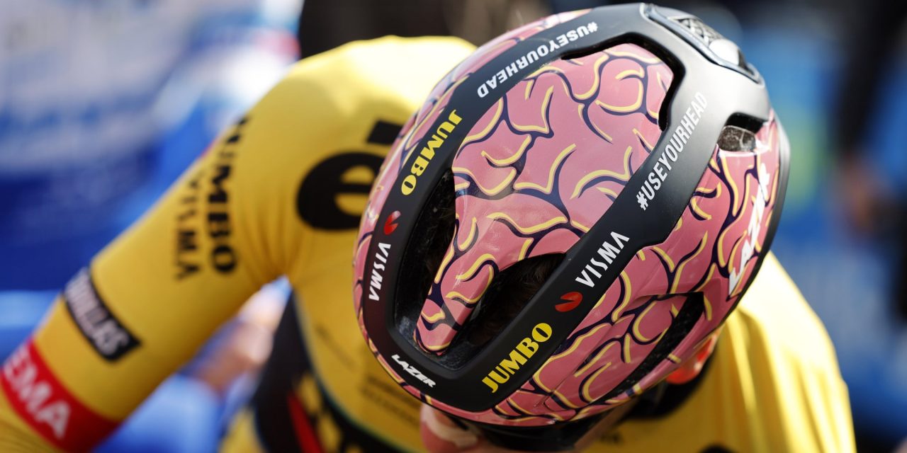 Zijn ploeg vroeg met een speciaal design in Parijs-Roubaix 2023 nog aandacht voor helmplicht.