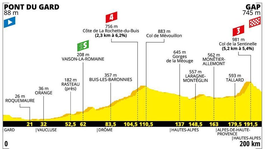 Maar echt veel tijd hebben de renners nu ook weer niet, aangezien ze tweehonderd kilometer moeten fietsen door het zuid-Franse landschap, met als eindbestemming Gap. Het peloton koerst eerst door de Rhônevallei, met zijn relatie vlakke wegen, op weg naar Orange. Deze Zuid-Franse stad kan pronken met zijn antieke theater en de triomfboog van Orange, die allebei op de Werelderfgoedlijst van UNESCO staan. En vergeet ook niet dat Orange vroeger de hoofdstad was van het gelijknamige vorstendom.