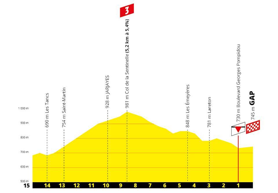 Ruim vijf kilometer eerder komen de renners aan de voet van de slotklim, die verder niet al te zwaar is. De Col de la Sentinelle is een echte loper, al zijn de laatste honderden meters wel een tikkeltje steiler. Eenmaal op de top gaat het direct via een smalle afzink naar beneden richting finishplaats Gap, al wordt deze afdaling tweemaal onderbroken door een korte tussenstrook. De laatste kilometer loopt dan weer heel lichtjes bergop.