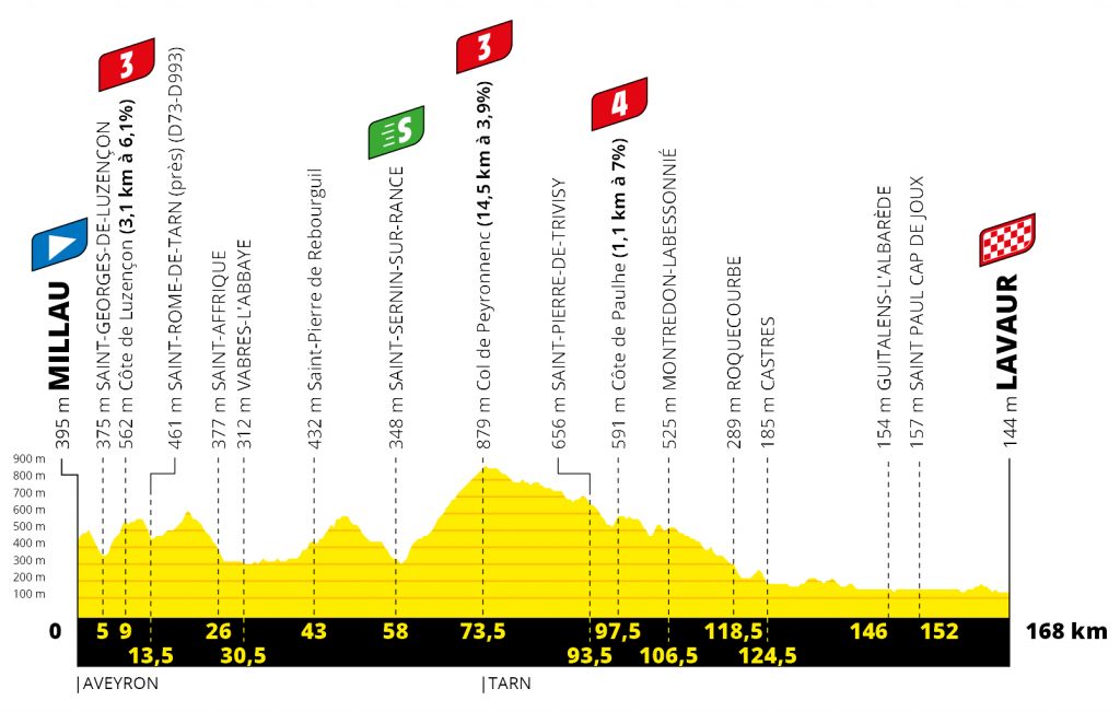 Het eerste gedeelte etappe stuurt de renners over glooiende wegen. Na 58 kilometer mag er in Saint-Sernin-sur-Rance gesprint worden voor de puntentrui. Op de top van de Col de Peyronnenc (14,5 kilometer aan 3,9%) zijn er opnieuw punten te verdienen voor het bergklassement. Vanaf de top van deze klim blijft het op en af gaan, maar met name in dalende lijn. Op de Côte de Paulhe (1,1 kilometer aan 7%) is nog een punt voor de bergtrui te verdienen.