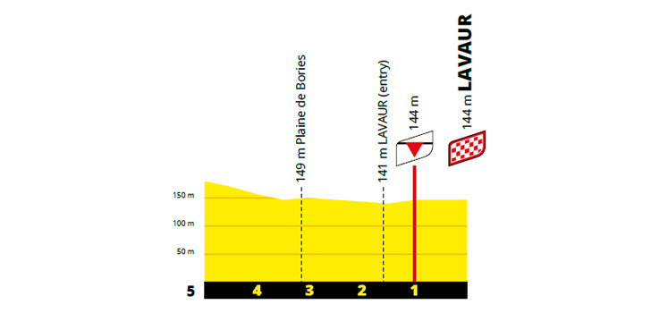 De slotfase voert over vlakke en overzichtelijke wegen. De aankomst in het centrum van Lavaur, een landelijk gelegen gemeente in de Dordogne, volgt na een lange rechte weg van twee kilometer. Als het de sprintersploegen lukt om het peloton bijeen te houden, wacht hier een nieuwe kans voor rassprinters.