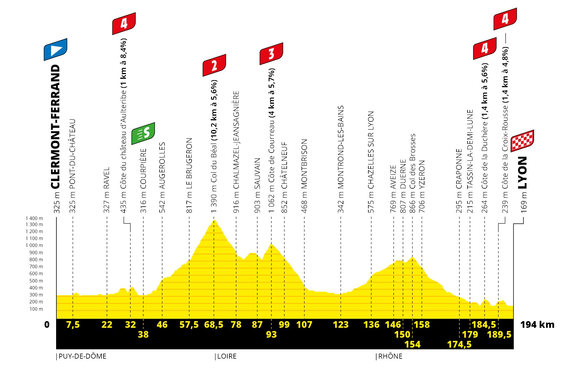 De veertiende Touretappe start in Clermont-Ferrand, een stad in de Auvergne met zijn kenmerkende zwarte kathedraal. Vanuit de universiteitsstad beginnen de renners aan een 194 kilometer lange rit naar Lyon. Deze rit is allesbehalve vlak en mogen we bestempelen als een overgangsrit. In de finale liggen drie korte, venijnige klimmetjes te wachten.