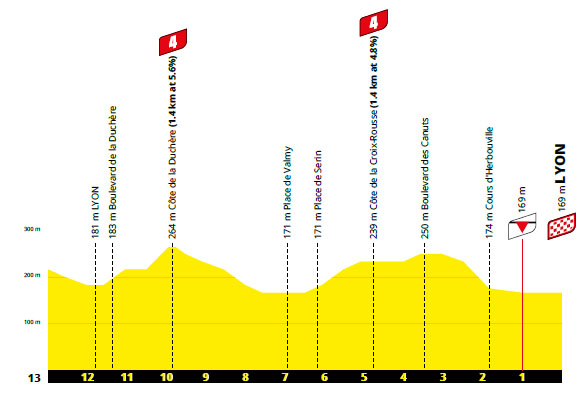 Vanuit westelijke richting komt de Tour Lyon binnen en kan de finale van de etappe beginnen. In de laatste vijftien kilometer liggen namelijk nog twee klimmetjes te wachten. Eerst leidt de route over de Côte de la Duchère (1,4 km aan 5,6%). Daarna steken de renners de rivier de Saône over en is de Côte de la Croix-Rousse (1,4 km aan 4,8%) de laatste helling voor de finish. Tot slot kronkelt de route zich naar de 1,8 kilometer lange laatste rechte lijn op de Quai Jean Moulin, een 6,5 meter brede weg aan de oevers van de Rhône.