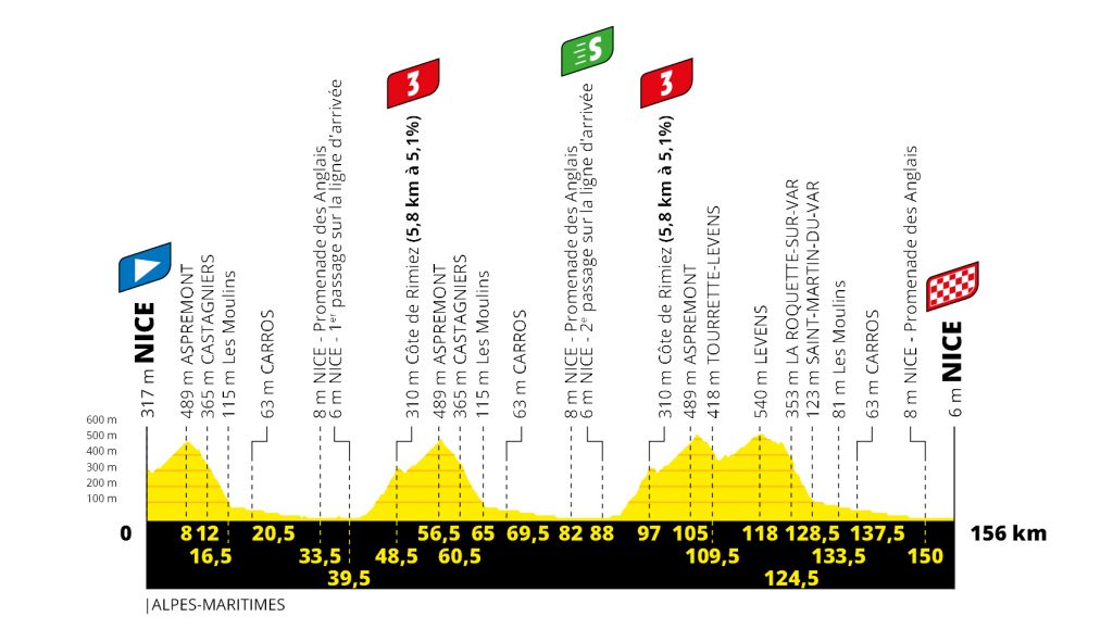 Tijdens de eerste rit rijdt het peloton een drietal lussen door het landschap van de Côte d’Azur. Vanuit de start loopt het een kleine acht kilometer lang omhoog naar Aspremont. Na deze klim met bescheiden stijgingspercentages dalen de renners af richting Carros. 25 kilometer verder bereikt het peloton voor de eerste keer de finishlijn, om exact dezelfde lus nogmaals af te leggen. In die lus ligt ook de eerste gecategoriseerde klim van de Tour: de Côte de Rimiez (5,8 km aan 5,1%) van derde categorie.