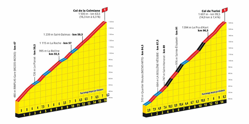 Met Col de la Colmiane krijgen de renners al snel een col van eerste categorie voorgeschoteld. De Colmiane is met zijn 16,3 kilometer aan 6,3% gemiddeld de eerste echt serieuze col van de Tour. Na de Colmiane gaat het in dalende lijn naar de Col du Turini (14,9 kilometer met een gemiddelde van 7,3%). De Turini (eveneens van eerste categorie) was in 2019 het toneel van de voorlaatste etappe van Paris-Nice en kent enkele steile stukken die boven de tien procent uitkomen.