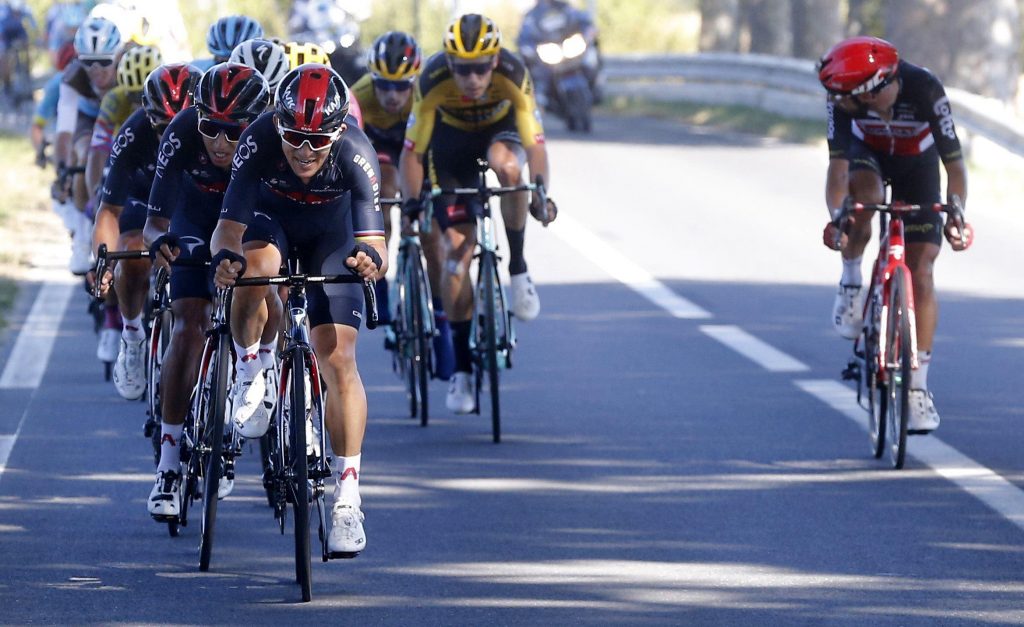 Waarom Castres? Na de passage door die stad op 45 kilometer van de streep draaide de weg zo dat de wind opnieuw in waaierstand stond. INEOS Grenadiers trok het peloton direct in drie waaiers. Onder de slachtoffers Tadej Pogacar, Mikel Landa, Richie Porte, Bauke Mollema en Esteban Chaves. De twee geloste groepen vonden elkaar, maar verloren wel rap 45 seconden op de voorste waaier van een veertigtal renners. Daar viel het echter alles behalve stil.
