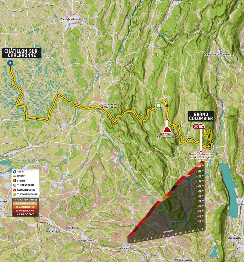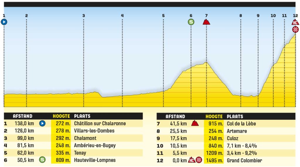 De eerste vijfentwintig daarvan zijn dalend dan wel vlak, maar vanaf Culoz is het klimmen geblazen. De Grand Colombier (17,4 aan 7,1%), die in 2012 voor het eerst in de Tour de France zat, is zo’n achttien kilometer lang aan exact zeven procent. Je bent vrij laag, dus de top ligt op ‘slechts’ 1495 meter hoogte. Veel coureurs van de huidige generatie weten maar al te goed hoe de klim loopt, want in het coronajaar 2020 waren er kort achter elkaar twee finishes. Eerst in de sterk bezette Tour de l’Ain, daarna in de Tour de France.