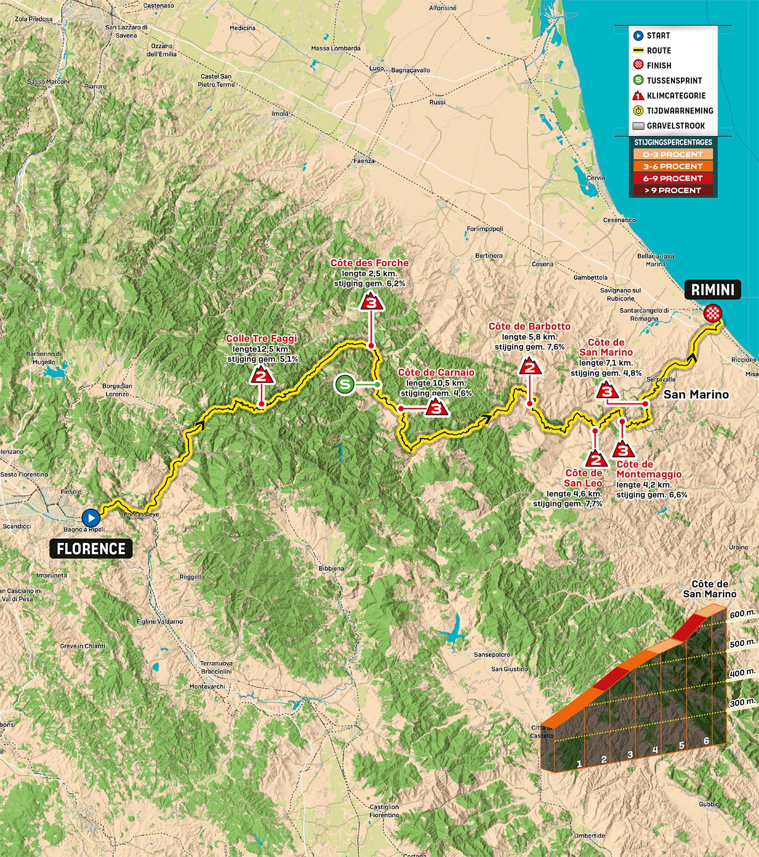 De 206 kilometer lange openingsetappe van Florence naar badplaats Rimini – waar de Italiaanse wielergod Marco Pantani in 2004 eenzaam stierf in hotelkamer 505 van Le Rose Suite Hotel – is meteen een flinke kluif met onderweg liefst zeven gecategoriseerde beklimmingen en ruim 3.800 hoogtemeters. Om u een idee te geven van de lastigheidsgraad: in de Alpen of Pyreneeën zijn er in het verleden wel eens ritten uitgetekend met minder hoogtemeters. We verwachten dan ook gelijk spektakel tussen de (klassements)renners.