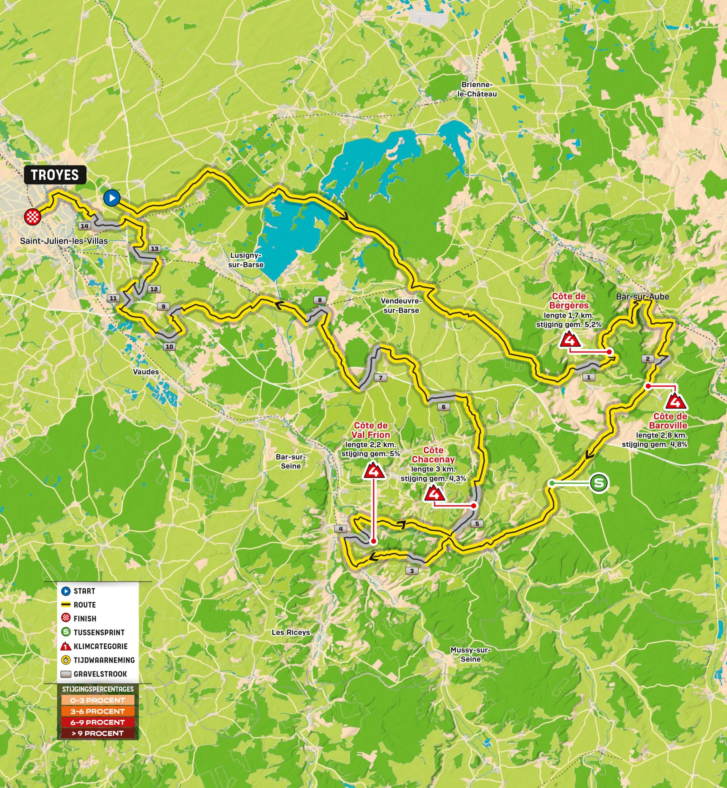 Waar de familie Simon dus de nodige successen wist te boeken in La Grande Boucle, hopen de renners in de rit van en naar Troyes ook dergelijke successen te behalen. De etappe kent een rustige start, maar na 47 kilometer verschijnt de eerste gravelstrook aan de horizon. Van Bligny naar Bergères rijden de renners over de eerste chemin blanc, die direct wordt gevolgd door de Côte de Bergères (1,7 km à 5,2%). De tweede grindsector valt ook samen met een klim, de Côte de Baroville (2,8 km à 4,8%).