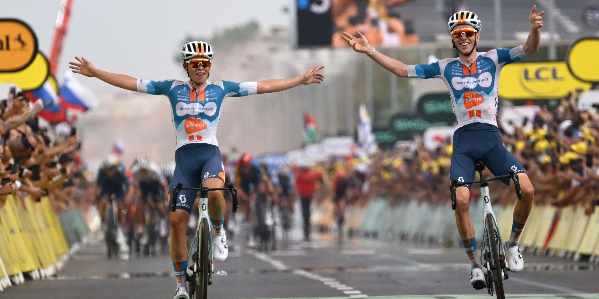 Het huzarenstukje van Team dsm-firmenich PostNL in de Tour van 2024, het één-tweetje van Bardet en Van den Broek (links) – foto: Cor Vos