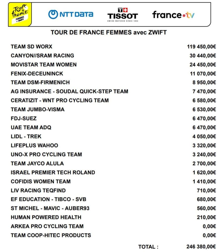 SD Worx verdiende bijna vier keer zoveel als Canyon//SRAM Racing, de nummer twee uit de lijst. Movistar vervolledigde het prijzengeldpodium. Helemaal onderaan zien we de ploegen Arkéa-Samsic en Coop-Hitec Products. Beide teams hielden niets over aan de Tour de France Femmes. Ook bij vier andere teams kwam de teller na acht dagen koers niet boven de duizend euro uit.
