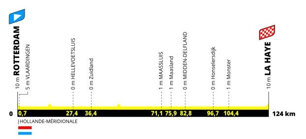 De Tour de France Femmes trapt af met een etappe van Rotterdam naar Den Haag. Het startschot klinkt in hartje Rotterdam bij het Museum Booijmans van Beuningen, met de vlag wordt er gezwaaid in Vlaardingen, de stad van de betreurde Connie Meijer, even ten westen van Rotterdam dus. Wat volgt is een typische Nederlandse rit met amper hoogtemeters. Toch heeft de organisatie een plaats gevonden om de eerste punten uit te delen voor de bolletjestrui.