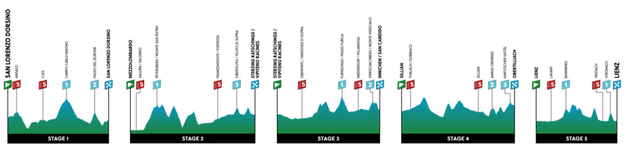 De rittenkoers begint in de regio Trentino, met San Lorenzo Dorsino als gastheer voor de start en aankomst van de eerste etappe. De klimbenen worden direct op de proef gesteld met beklimmingen als de Campo Carlo Magno de Passo del Durone op het menu. De volgende dag liggen echter de meeste hoogtemeters in het verschiet. De Monte San Pietro vormt in deze rit een vroeg obstakel, maar de echte uitdaging wacht op het slotcircuit. In Sterzing/Vipiteno werken de renners twee ronden 16 kilometer af. Elke ronde bevat de beproeving Obertelfes/Telves di Sopra (4 km à 7%) gevolgd door een technische afdaling, die eindigt op 8 kilometer van de finish.