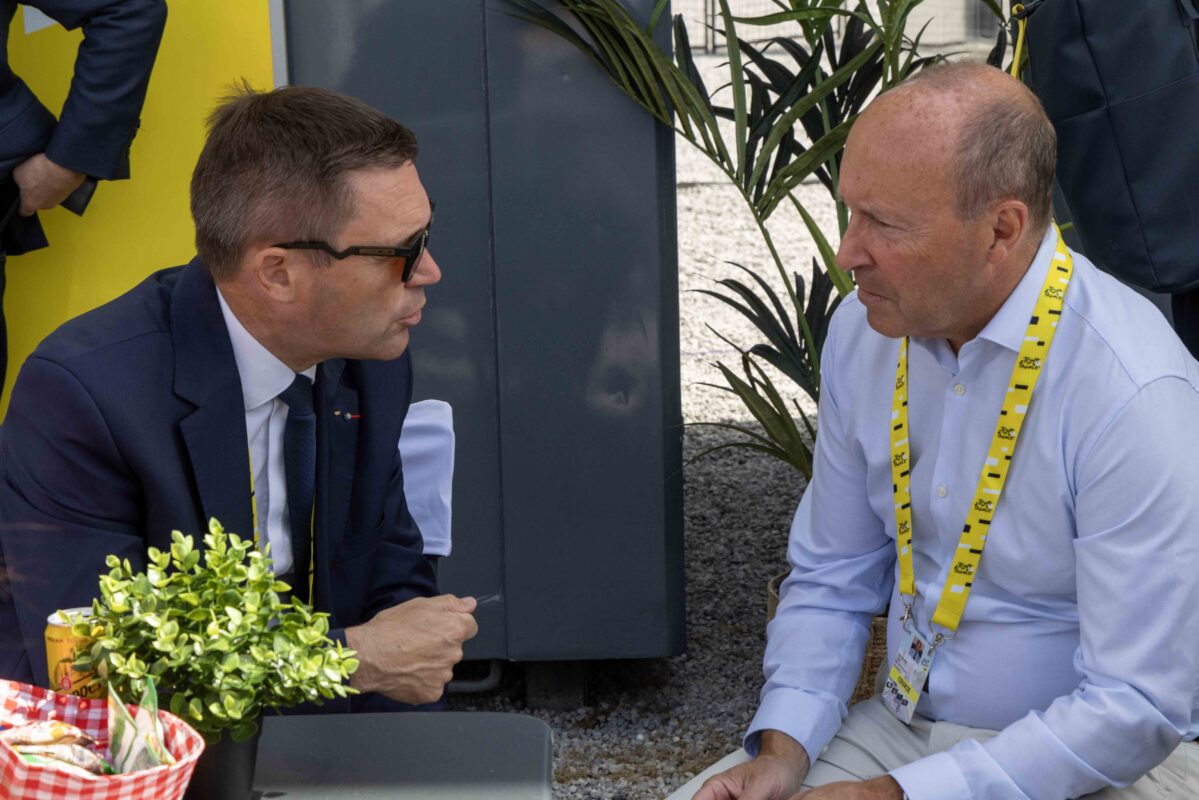 David Lappartient in gesprek met Tom Vandamme voorzitter van Belgian Cycling. Foto: Raymond Kerckhoffs