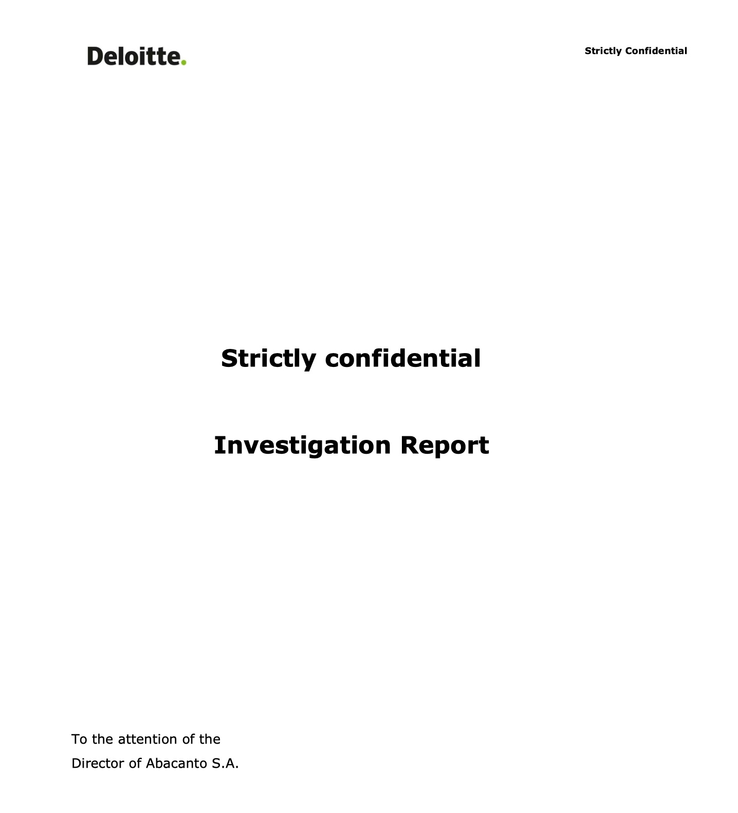 Toen Yana Seel in 2019 de positie van algemeen directeur overnam gaf ze Deloitte de opdracht een onderzoek te starten naar de financiële huishouding. Het forensisch team onderzocht alle beschikbare bankafschriften tussen 2017 en 2018, analyseerde contracten tussen het team en verschillende externe partijen en voerde verschillende gesprekken met Seel om een volledig beeld te krijgen van het wel en wee binnen Abancanto SA.