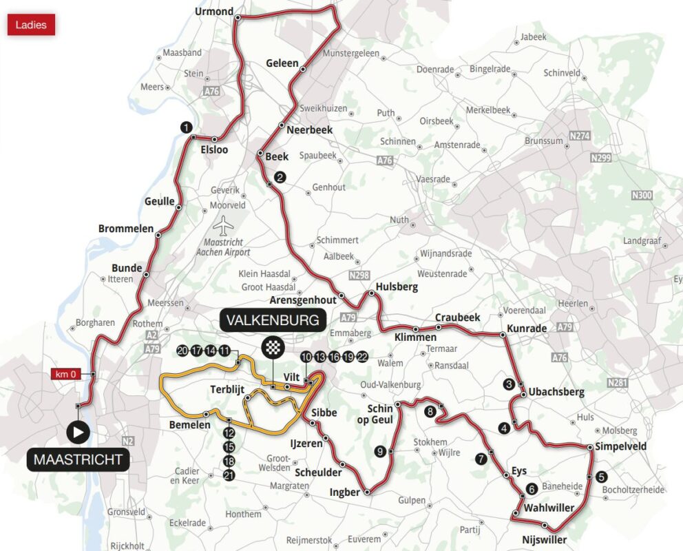 Na een kilometer of zestig wordt het voor het eerst echt lastig, met de Kruisberg, de Eyserbosweg, de Fromberg en de Keutenberg kort achter elkaar. Vervolgens draaien de rensters het circuit op, dat in totaal vier keer moet worden afgewerkt. De laatste keer wordt er vanaf de top van de Bemelerberg niet direct richting de Daalhemmerweg gereden, maar wordt er een klein ommetje genomen.