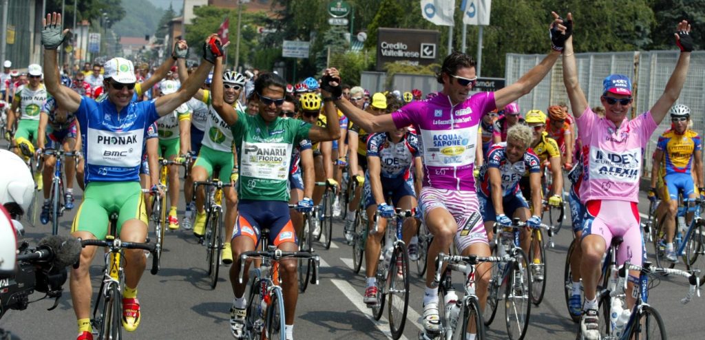 Massimo Strazzer (links) in de slotrit van de Giro 2002 samen met Julio Aberto Perez Cuapio, Mario Cipollini en Paolo Savoldelli – foto: Cor Vos