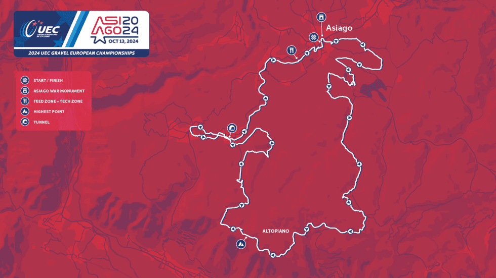 Start en finish van de Europese kampioenschappen zijn op het Piazza Giovanni Carli, een rond plein omgeven door kathedralen. Het parcours rijdt de renners over de beste gravelwegen van het bekende Altipiano di Asiago, een beschermd natuurgebied in de regio Veneto. De organisator deelde de GPX-documenten pas een week van te voren, om ervoor te zorgen dat het gebied in de maanden voor het EK niet te veel bezoekers trok. Via het centrum Asiago (bekend van de gelijknamige kaas en schaatser Enrico Fabris, die op de Winterspelen van 2006 in Turijn goud veroverde op de 1500 meter), volgt een grote lus hen ten zuiden van het stadje.