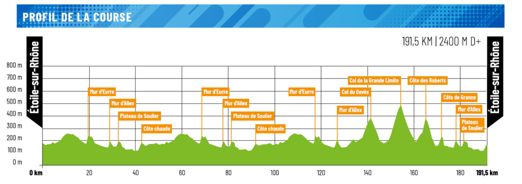 Deze finale wordt ingeluid door de Col du Devès (4,2 km aan 4,5%). Vervolgens wacht het dak van de wedstrijd: de 515 meter hoge Col de la Grande Limite (3,9 km aan 6,6%). Hierna volgt een serie heuvels met Côte des Roberts (1,6 km aan 8,0%), de Côte de Grane (1,7 km aan 5,5%) en voor een laatste keer de Mur d’Allex en de Plateau de Soulier. Na de top van deze laatste heuvel is het nog minder dan tien kilometer tot de finish in Étoile-sur-Rhône.
