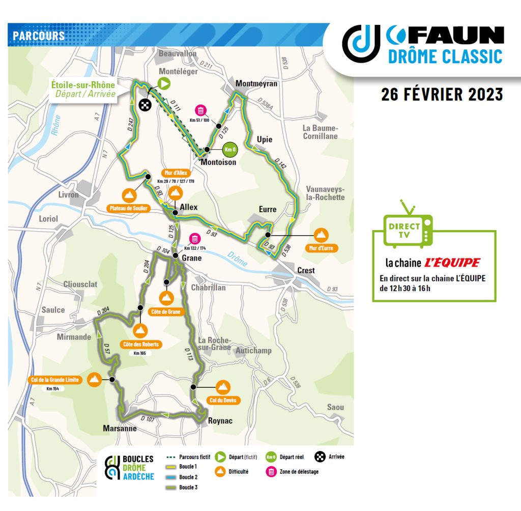 Het parcours van de Faun Drôme Classic is exact hetzelfde als in 2022. Opnieuw is Étoile-sur-Rhône start -en finishlocatie, opnieuw moet er 191,5 kilometer afgelegd worden en opnieuw krijgen de coureurs de nodige hellingen voor de kiezen.