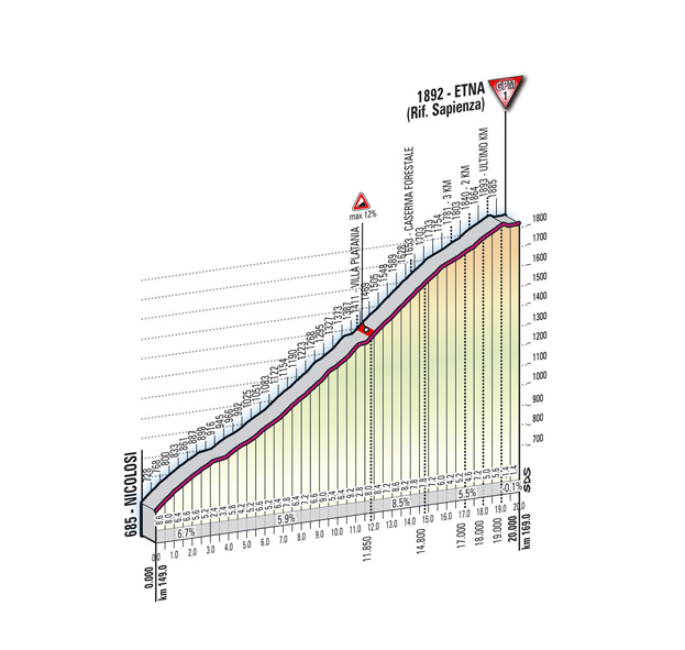 Vanuit Acireale wordt er al weer lichtelijk geklommen, maar de echte klim begint op twintig kilometer van de streep. De aankomst ligt aan het Rifugio Sapienza en langs deze kant is de gemiddelde stijging 6,2 procent. Het steilste stukje is 12 procent en ligt op acht kilometer van de top.