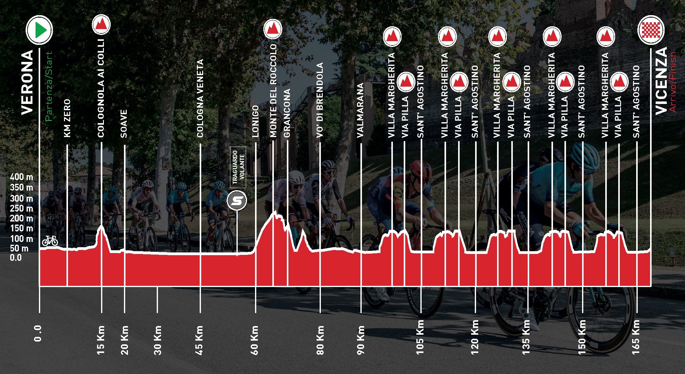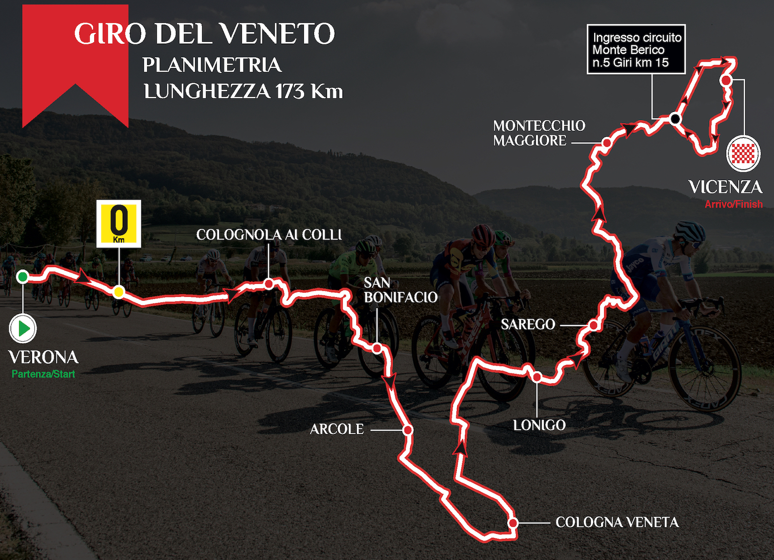 Wat kunnen we vertellen over de aanloopfase? Vanuit Verona gaat het in oostelijke richting naar Vicenza, maar daarbij maakt het peloton wel een zuidelijke lus. In de eerste twee uur liggen nog de Colognola ai Colli (1,3 km aan 7,8%) en de Monte del Roccolo (4,9 km aan 3,9%), maar daarna volgen nog honderd kilometers. De finale begint op een kleine tachtig kilometer van de finish als de renners het vijftien kilometer lange circuit bereiken.