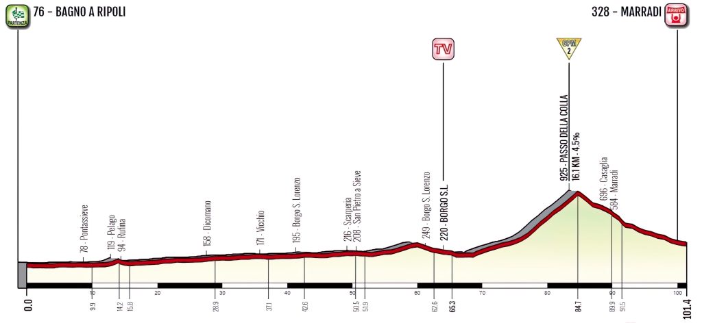De eerste kilometers voeren langs de Arno, daarna wordt de loop van de Sieve gevolgd, bijna tot aan de bron. Een niets-aan-de-hand-rit, maar dat verandert in de finale. Want dan wacht de Passo della Colla. Vanuit Borgo San Lorenzo is het 16,5 kilometer klimmen aan een gemiddelde van 4,4 procent. Niet al te lastig, maar het venijn zit ‘m in de staart van de klim. Daar loopt het stijgingspercentage namelijk soms tegen de tien procent.