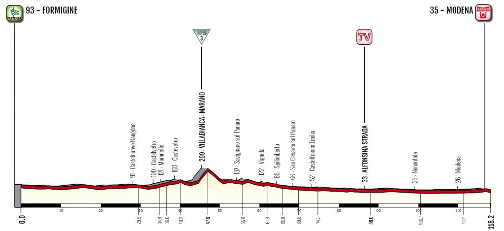 Formigine is een mooi vertrekpunt voor een stevige tocht door de Apennijnen, maar dat zit er op een klimmetje na niet in. En dat klimmetje naar het gehucht Villabianca ligt ook nog eens in de eerste helft van de wedstrijd. Nee, dit zal vooral een etappe voor de snelheidsduivels worden. Niet verrassend, want de streek waarin gefietst wordt staat bekend om snelle auto’s. Modena is de geboorteplaats van Enzo Ferrari, maar ook Ferruccio Lamborghini groeide op in de streek. De hoofdzetels van beide rivaliserende automerken vinden we in de streek, maar erlangs rijden doet het peloton niet.